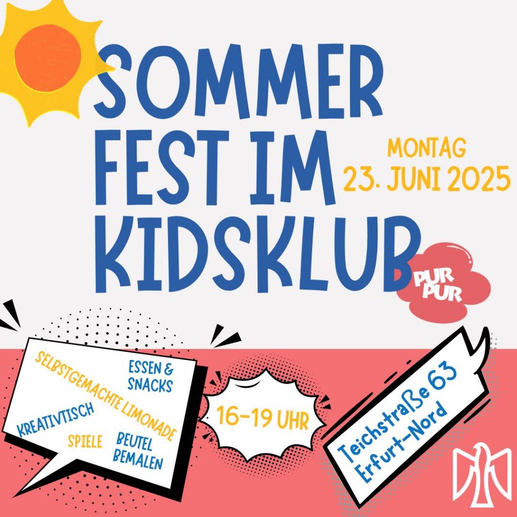 Heraus zum Sommerfest! Am Montag laden wir herzlich in unseren Kidsklub Purpur zum Sommerfest ein. Wir wollen kurz vor den Ferien selbstgemachte kalte Limonade schlürfen, Beutel bemalen, zusammen futtern und eine gute Zeit haben.