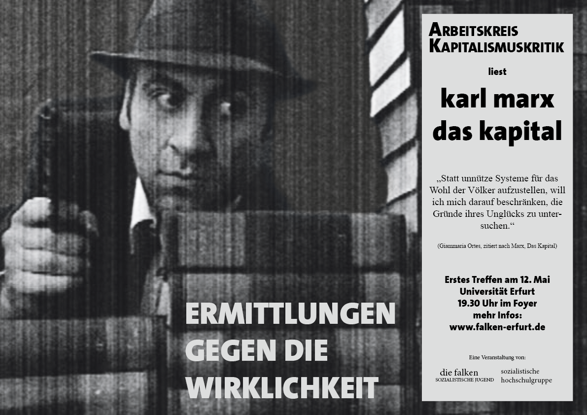 Unter diesem Motto möchten wir im Arbeitskreis Kapitalismuskritik das Marxsche Kapital lesen.