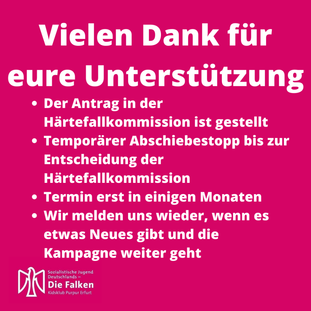 Wir haben eine Petition gestartet, die sich an die Mitglieder der Thüringer Härtefallkommission richtet. Unterzeichnen könnt ihr die Petition hier.