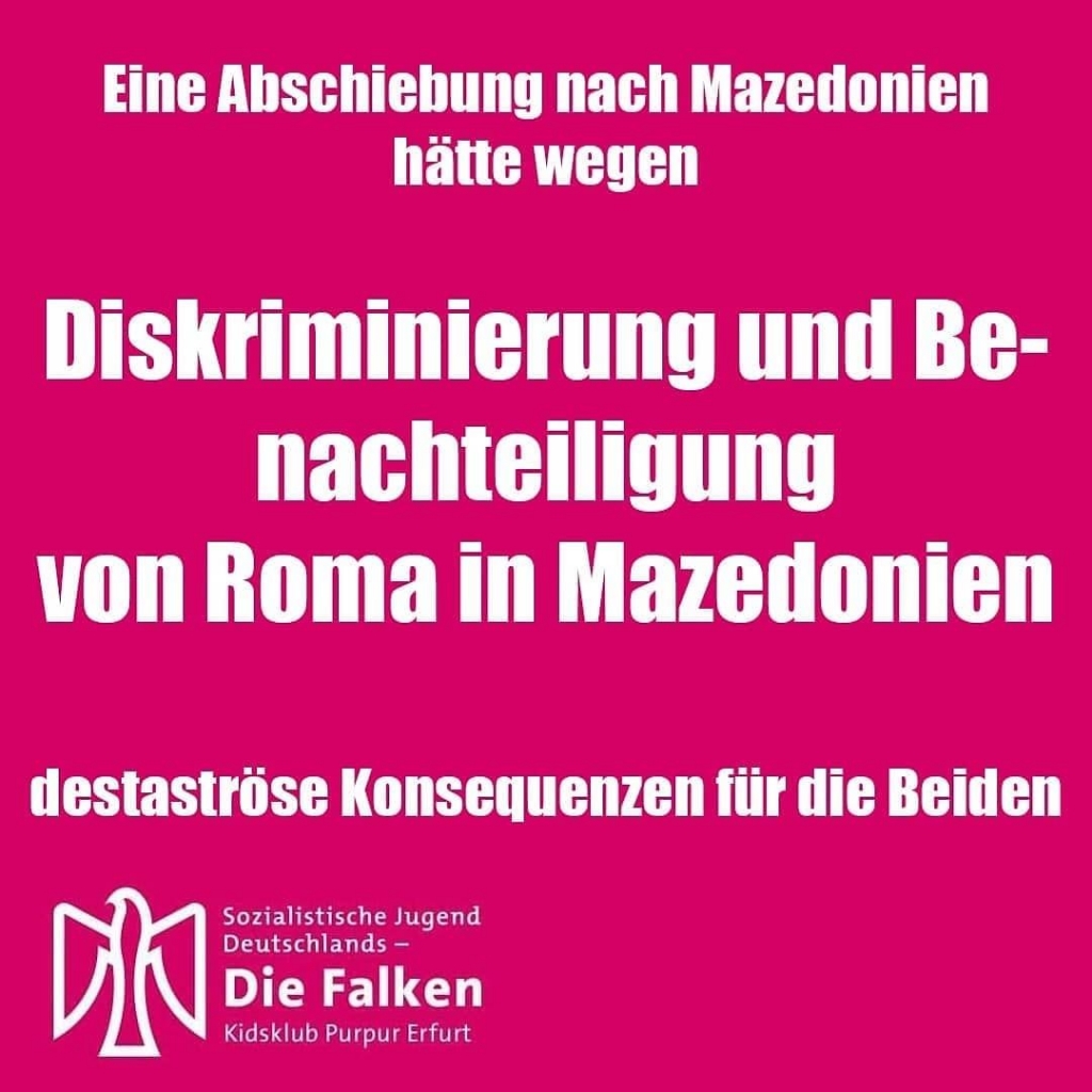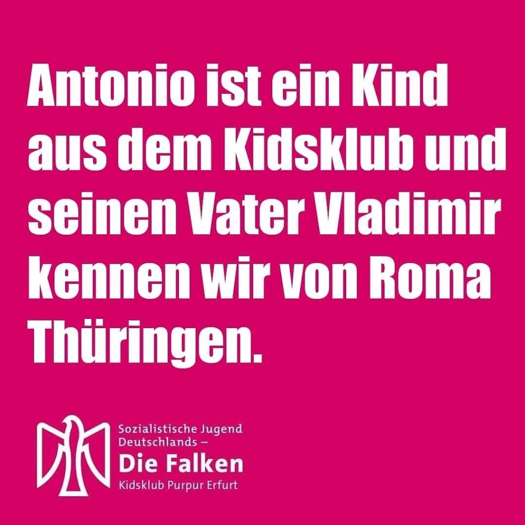 Derzeit sind zwei Freunde von uns, Antonio und Vladimir, akut von Abschiebung bedroht. Antonio kennen wir aus dem Kidsklub Purpur, seinen Vater Vladimir kennen wir über sein Engagement für die Belange von Sinti und Roma in Thüringen. Eine Abschiebung nach Mazedonien hätte aufgrund der Diskriminierung und Benachteiligung von Roma in Mazedonien desaströse Konsequenzen für die beiden. Verstärkt wird dies durch Covid-19, da Roma in Mazedonien aufgrund der prekären gesellschaftlichen Lage besonders von Covid-19 bedroht sind und ihnen gleichzeitig häufig grundlegende eine gesundheitliche Versorgung verwehrt wird.