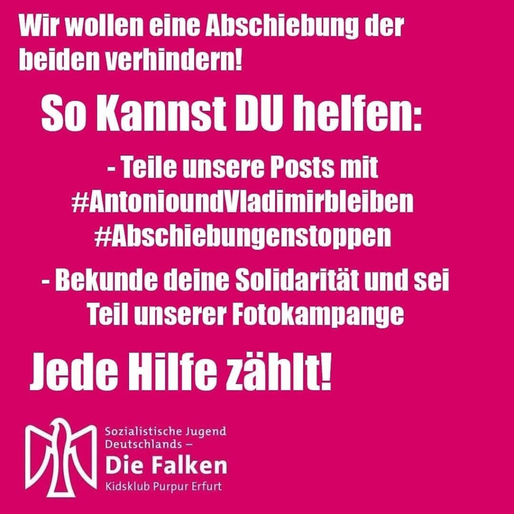 Auf dieser Seite findet ihr alle aktuellen Informationen. Derzeit geht es darum, einen Härtefallantrag bei der Thüringer Härtefallkommission zu stellen. Wir möchten zeigen, wieviele Freund:innen und Unterstützer:innen Antonio und Vladimir in Erfurt haben und dass ihr Verschwinden nicht unbemerkt bleibt. Dabei könnt ihr uns helfen: