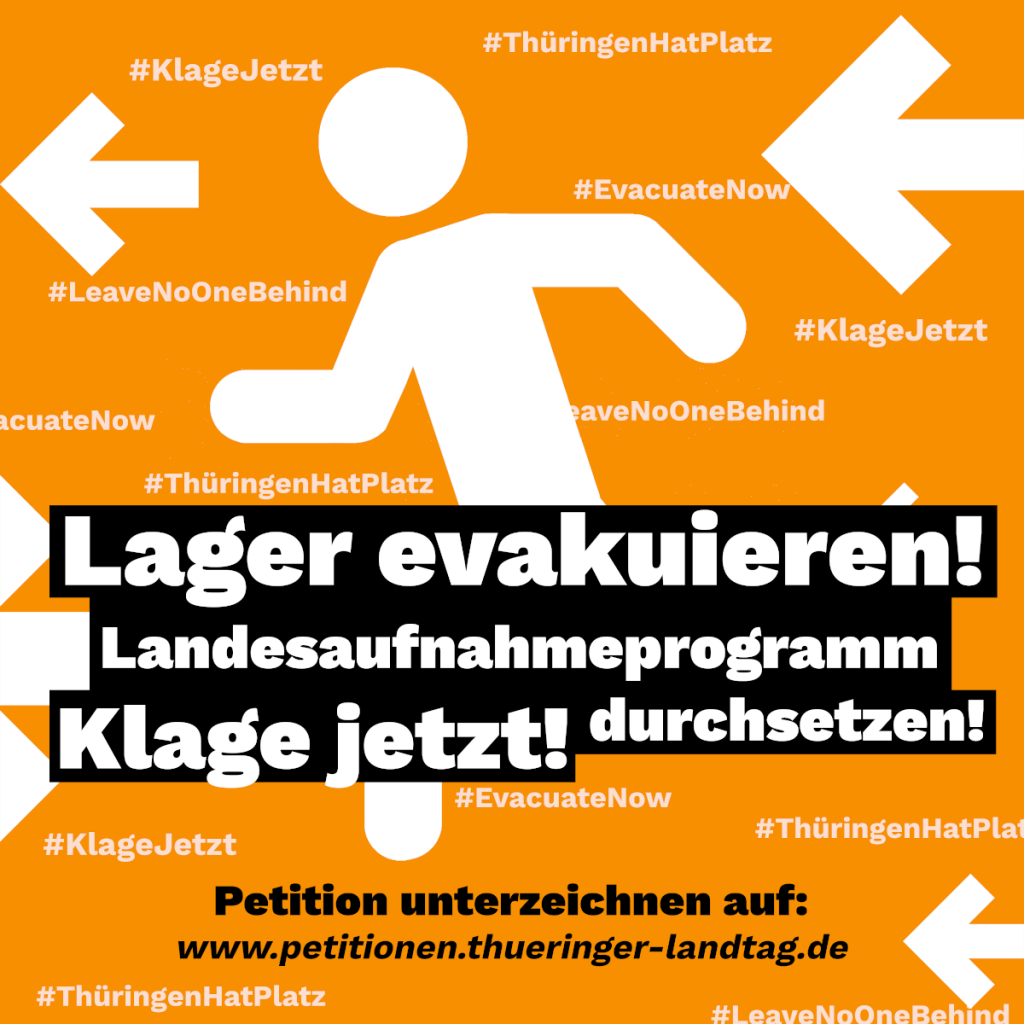 Wir möchten die Plattform nutzen um auf eine weitere Petition aufmerksam zu machen. Gemeinsam mit 17 weiteren Thüringer Organisationen und Initiativen hat die Seebrücke Erfurt die Petition „Aufnahmeprogramm durchsetzen – Klage gegen das BMI jetzt!“ beim Thüringer Landtag eingereicht. Gemeinsam wollen sie Druck machen auf die Thüringer Landesregierung: Sie soll konsequent hinter ihrem Beschluss des Landesaufnahmeprogramms stehen und mit einer Klage gegen das Bundesinnenministerium alle Hebel in Bewegung setzen, um endlich Geflüchtete aus den griechischen Lagern aufzunehmen. Denn das ist ja wohl das Allermindeste. Bis zum 10. Mai kann die Petitition auf der Petitionsplattform des Thüringer Landtags unterzeichnet werden.