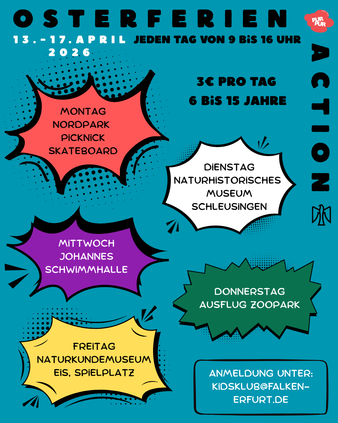 Montag, 13.04.: Nordpark mit Picknick und Skateboard fahrenDienstag, 14.04. (bitte pünktlich um 9 Uhr am Kidsklub sein): Ausflug ins Naturhistorische Museum in Schleusingen – wir reisen in die Urgeschichte bis zu den SauriernMittwoch, 15.04.: Ausflug in die JohannesschwimmhalleDonnerstag, 16.04.: Ausflug in den Zoopark in Erfurt Freitag, 17.04.: Ausflug ins Naturkundemuseum, Eis essen und Spielplatz in der Innenstadt