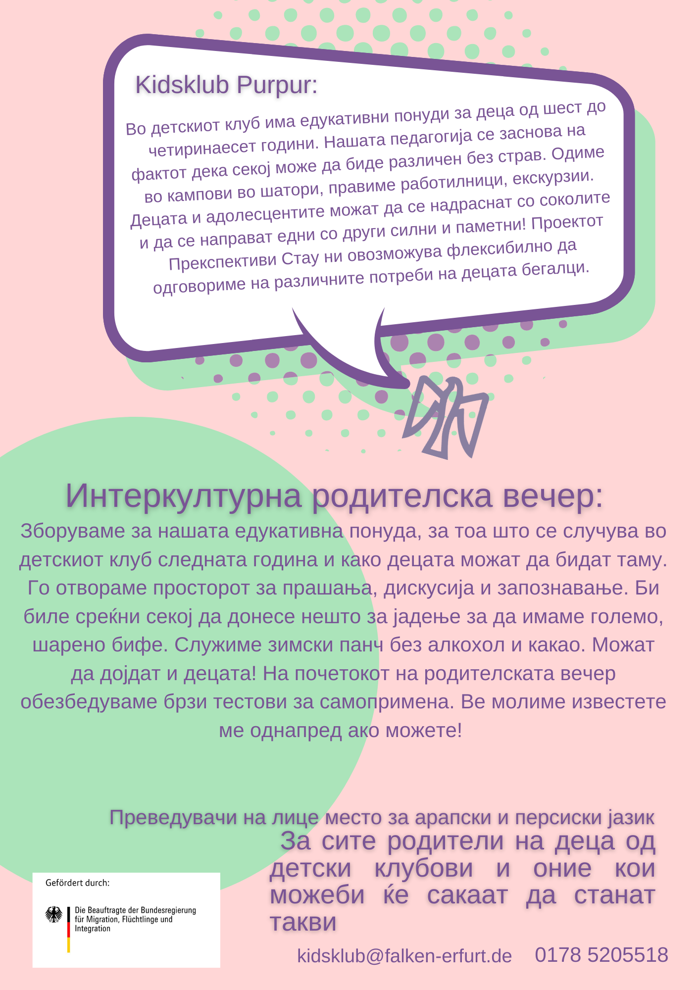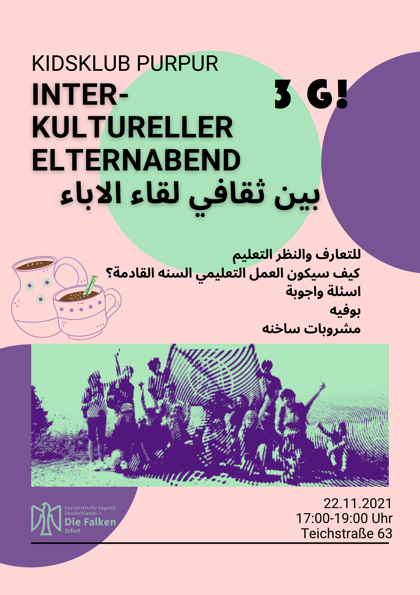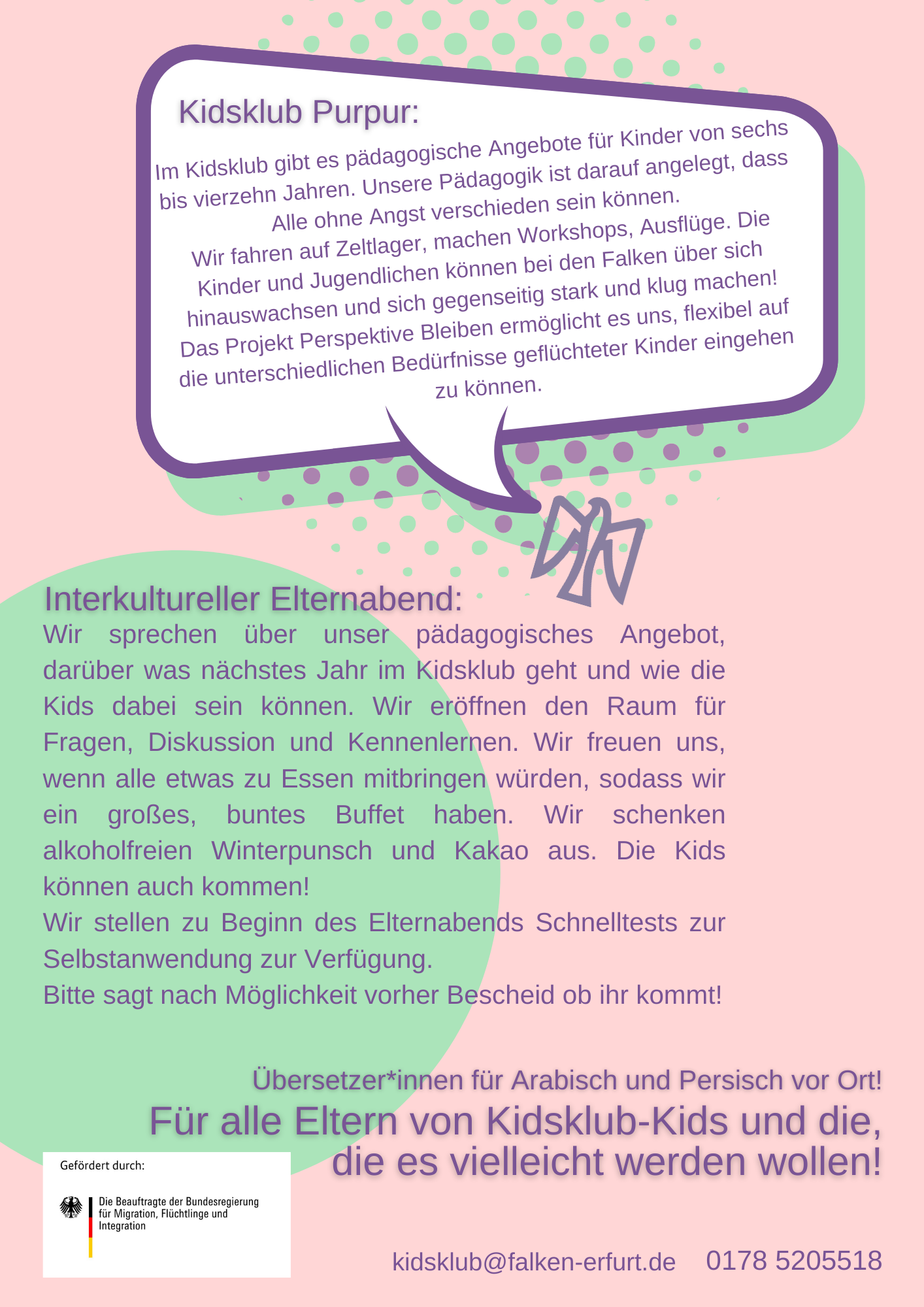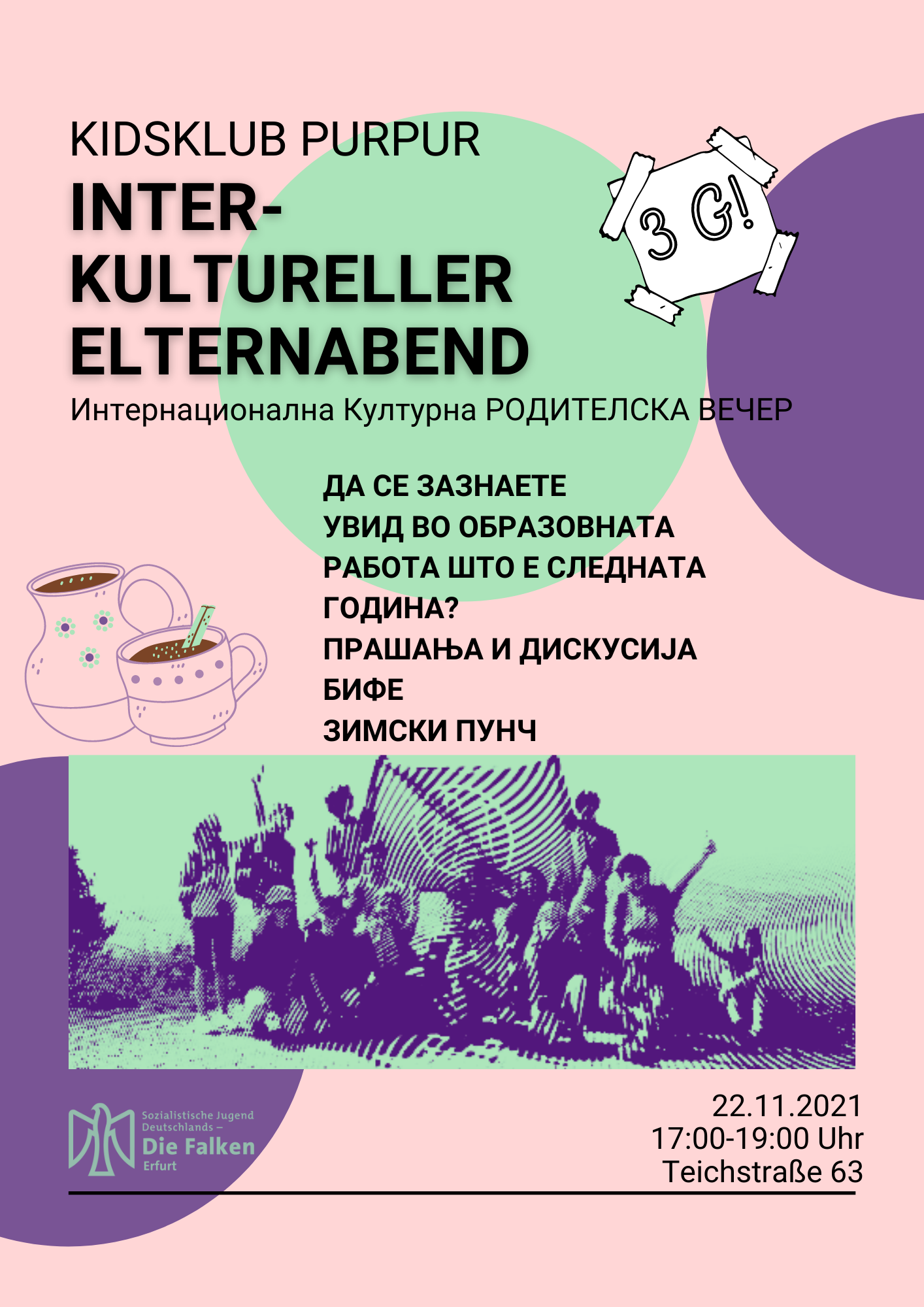 Am 22.11.2021 findet im Kidsklub unser interkultureller Elternabend statt. Von 17:00-19:00 Uhr wollen wir uns mit den Eltern austauschen, von unserer Arbeit berichten und davon, was schon für das nächste Jahr geplant ist.