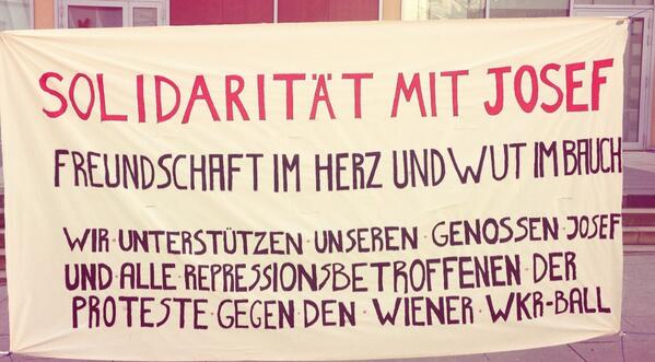 Unser Genosse Josef, der am 24. Januar im Zuge der Proteste gegen den sogenannten Akademikerball festgenommen wurde – ein jährlich stattfindendes Treffen führender VertreterInnen rechtspopulistischer Parteien, schlagenden Burschenschaftlern und HolocaustleugnerInnen aus ganz Europa –, sitzt nach wie vor im Knast im fernen Wien.