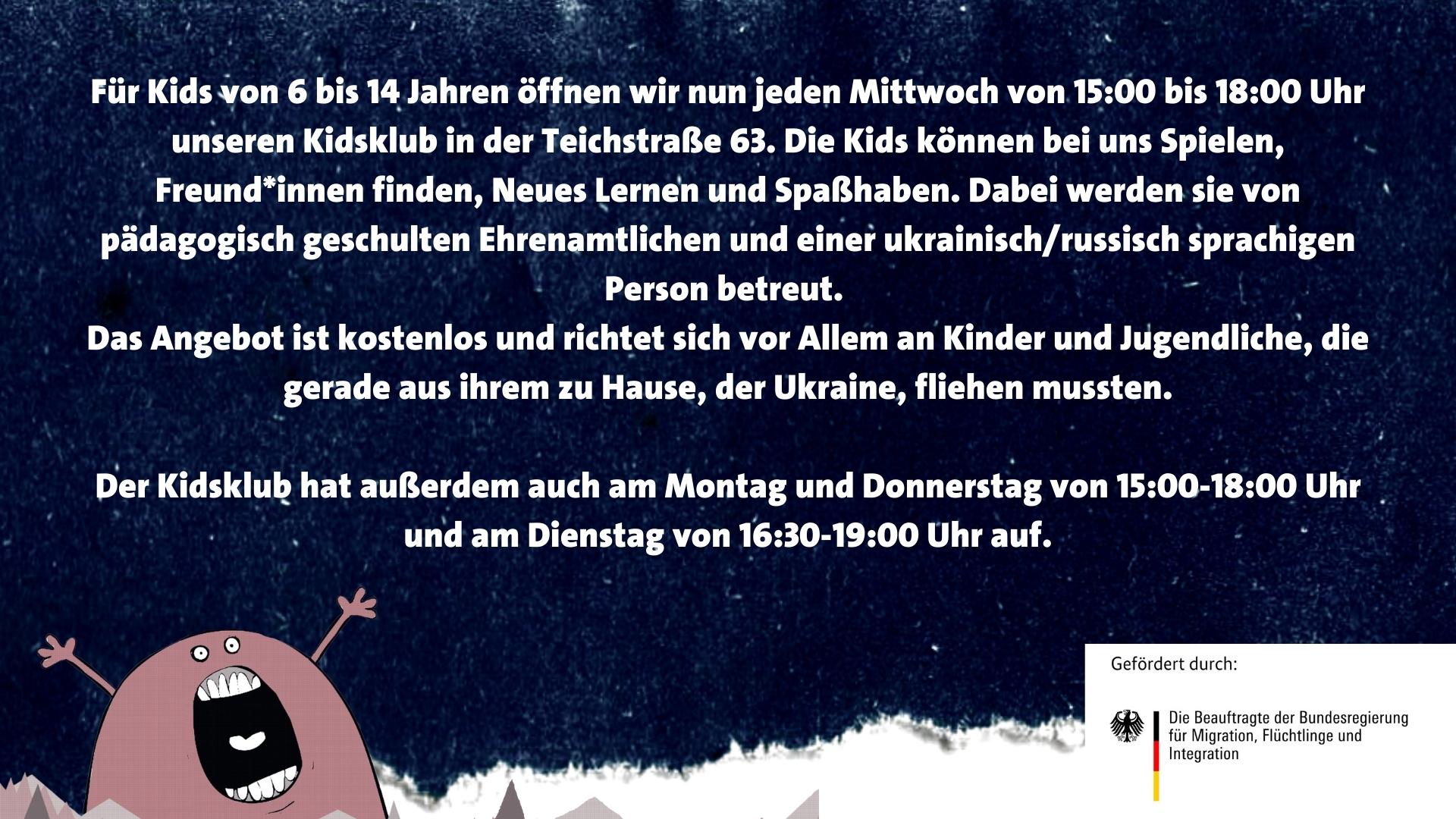 Für Kids von 6 bis 14 Jahren öffnen wir nun jeden Mittwoch von 15:00 bis 18:00 Uhr unseren Kidsklub in der Teichstraße 63. Die Kids können bei uns spielen, Freund*innen finden, Neues Lernen und Spaßhaben. Dabei werden sie von pädagogisch geschulten Ehrenamtlichen und einer ukrainisch/russisch sprachigen Person betreut.