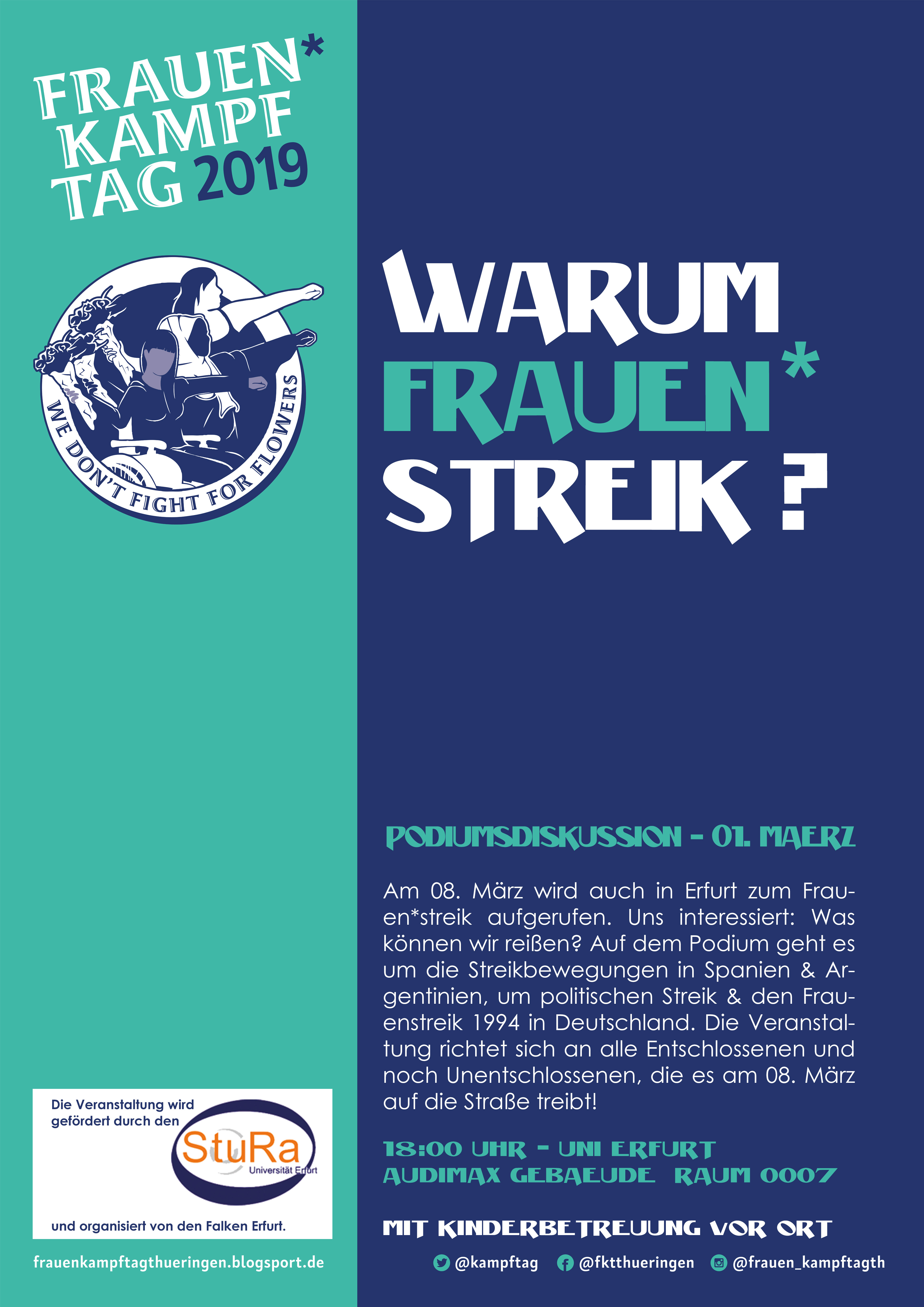 Auch dieses Jahr beteiligen wir uns mit einer Veranstaltung am Frauen*kampftagsbündnis Thüringen und rufen dazu auf, am 08. März auf die Straße zu gehen.