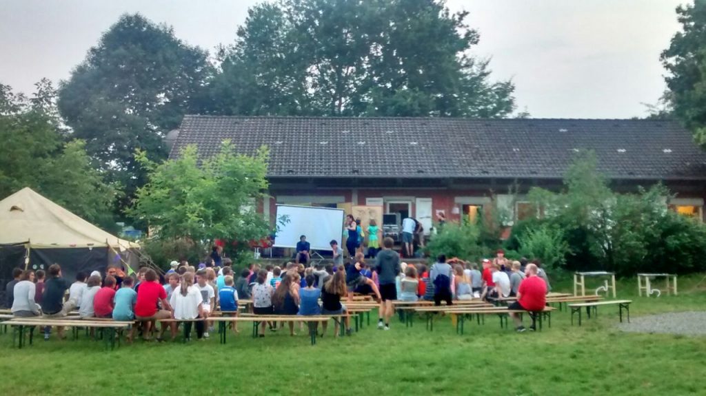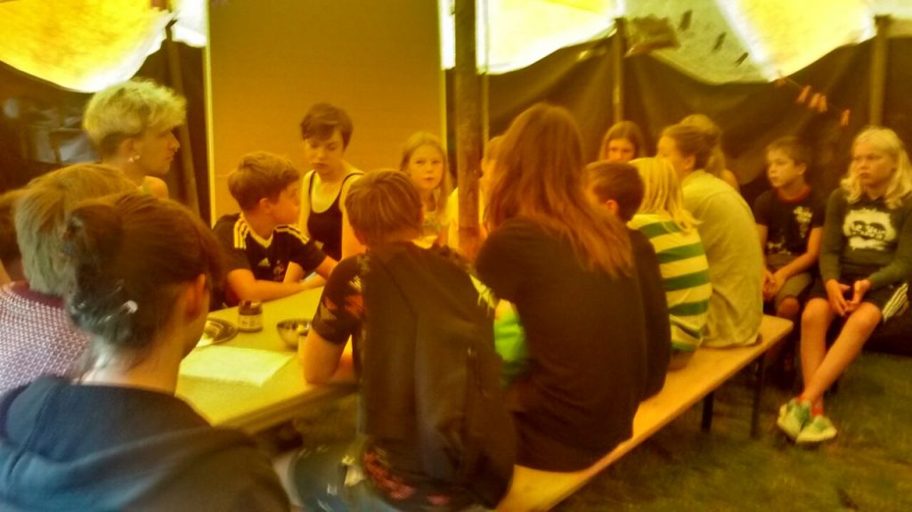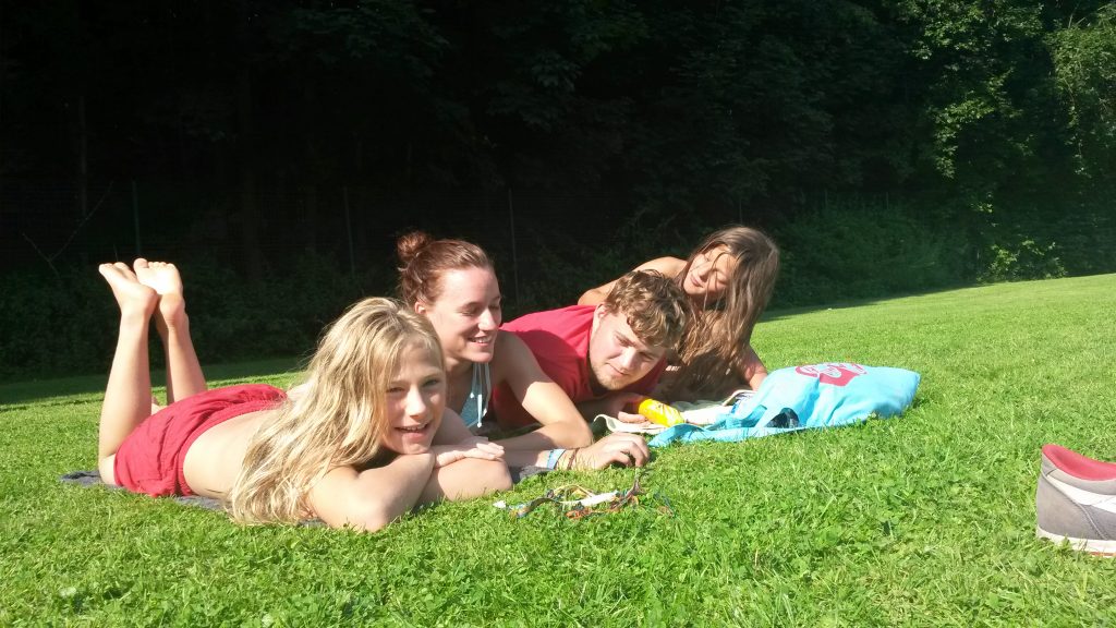 Auf dem Programm stehen Freibad und sonnenbaden, diskutieren und entscheiden, kochen und abwaschen, basteln und malen, Volleyball und basteln, aber auch Müll aufsammeln, sauber machen und Zelt aufräumen.