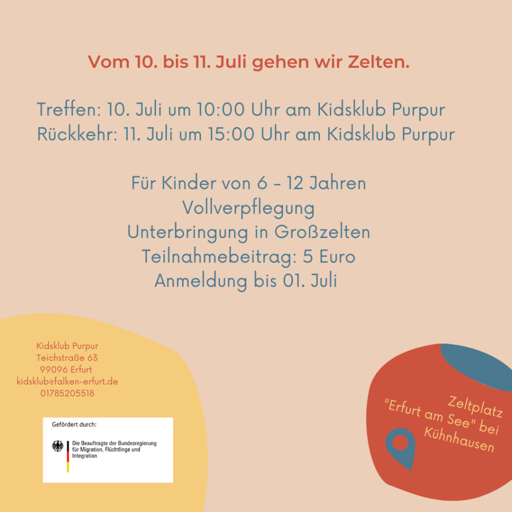 Wir treffen uns am 10. Juli um 10:00 Uhr an unserem Kidsklub Purpur. Von dort aus gelangen wir mit öffentlichen Verkehrsmitteln und zu Fuß zu unserem Ausflugsziel, dem Zeltplatz „Erfurt am See“ (Steinfeld 4, 99189 Erfurt – Kühnhausen, Deutschland). Hier werden die Kinder auf zwei unserer Großzelte – deren Schlafzelte – aufgeteilt. Unsere Pädagogik ist koedukativ, weshalb die Unterbringung in den Zelten nicht geschlechter-getrennt stattfindet.